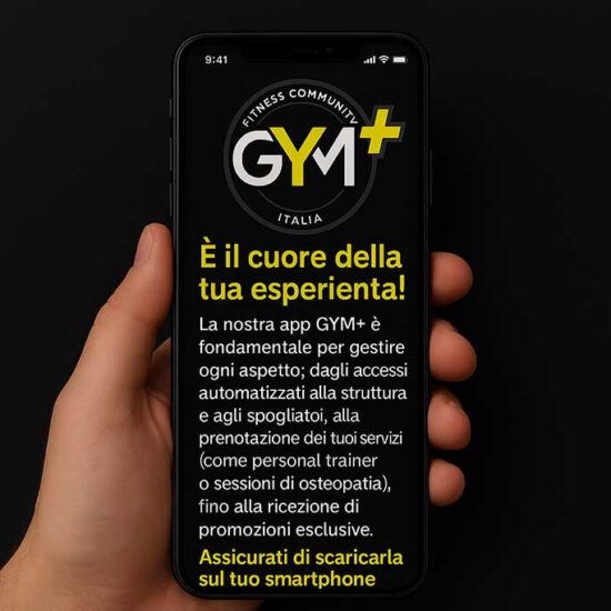 Il cuore dell’esperienza Gym+ è l’app dedicata, il tuo alleato per allenamenti senza pensieri. Con l’app puoi entrare in palestra e negli spogliatoi con un semplice tocco, prenotare servizi come personal trainer e sessioni di fisioterapia, e organizzare tutte le tue attività in modo rapido e intuitivo. Inoltre, riceverai promozioni esclusive e sconti dedicati, per un’esperienza semplice, completa e gratificante.